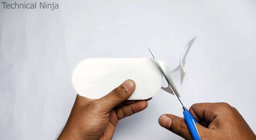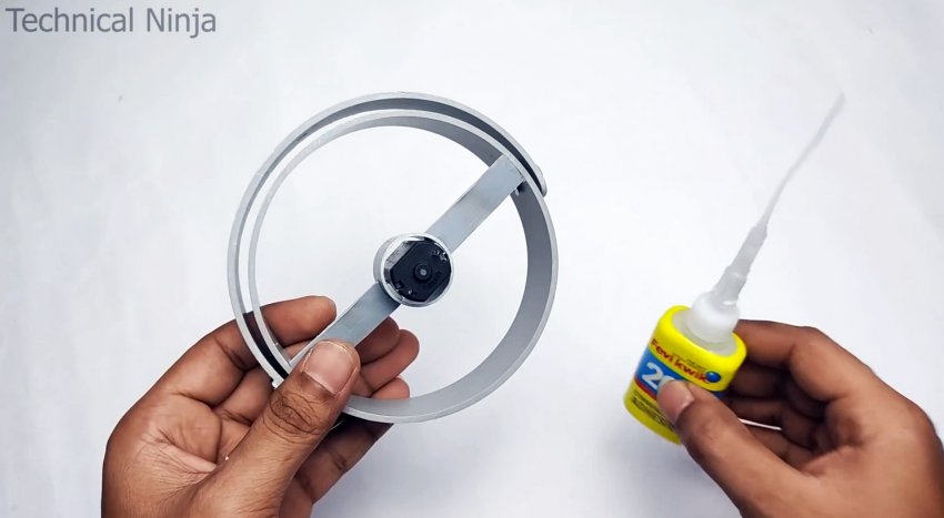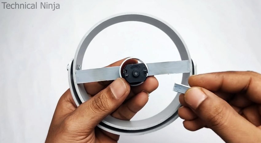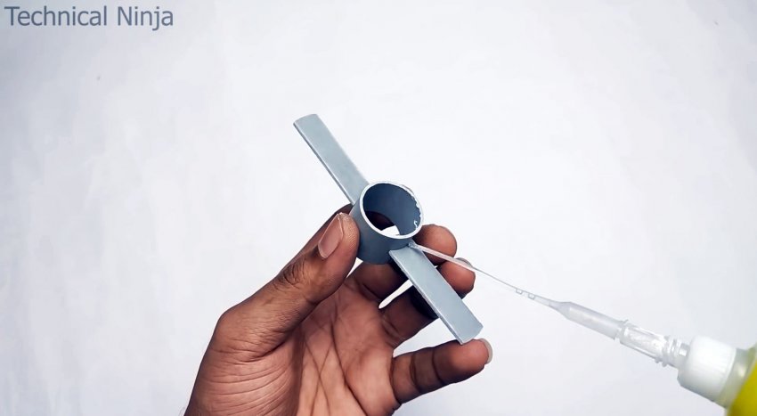 От тонкой пластиковой трубки отрезается кольцо длиной 30 мм. Также из нее нужно вырезать 2 полосы. Кольцо и полосы вклеиваются в диффузор. В него помещается небольшой двигатель постоянного тока, и также приклеивается.