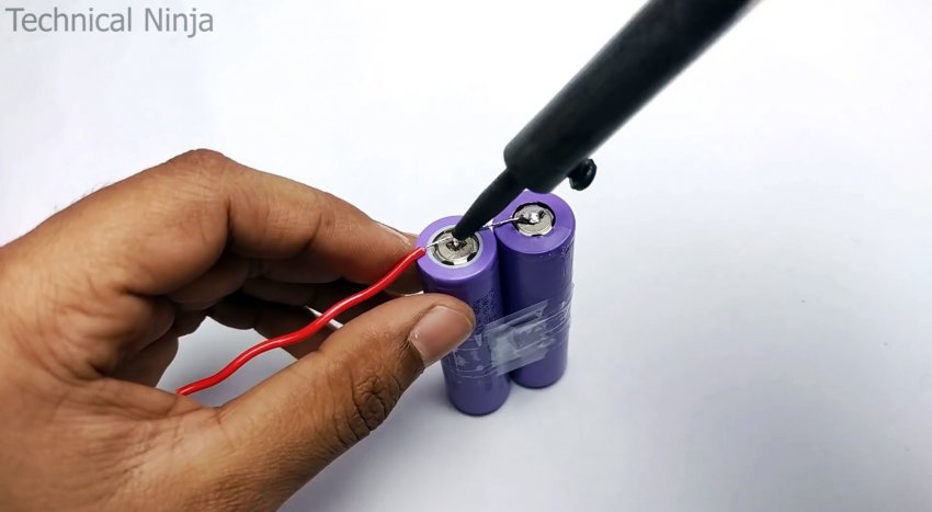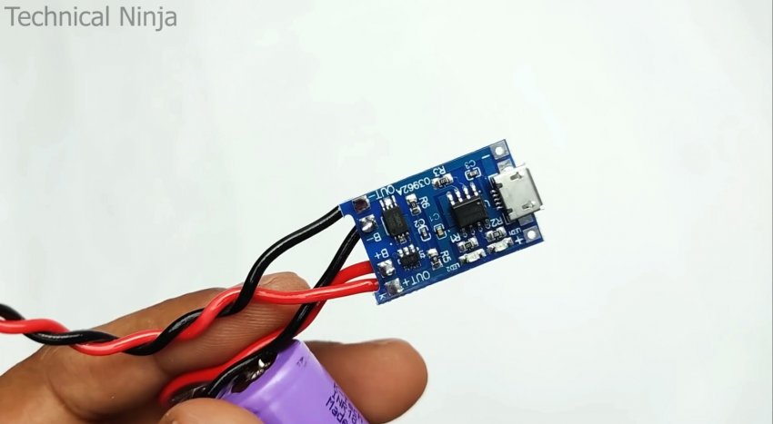 К контактам двух аккумуляторов припаиваются провода. Затем они подключаются к модулю зарядки. Подключение выполняется по предложенной схеме с подключением ШИМ регулятора.