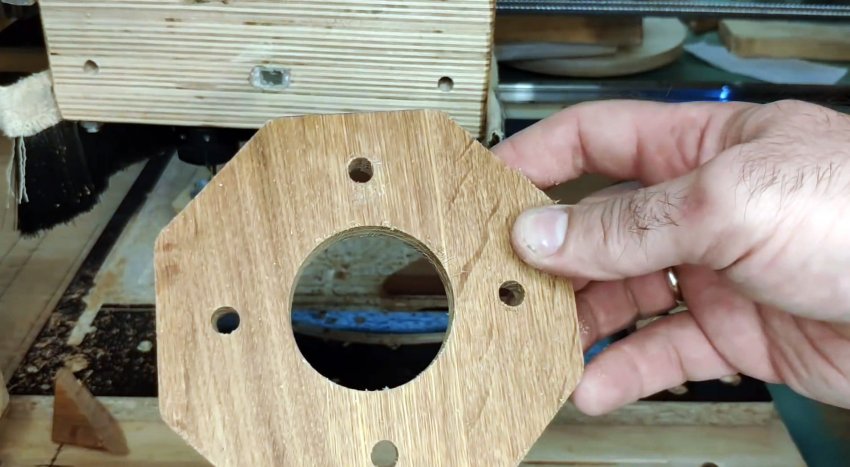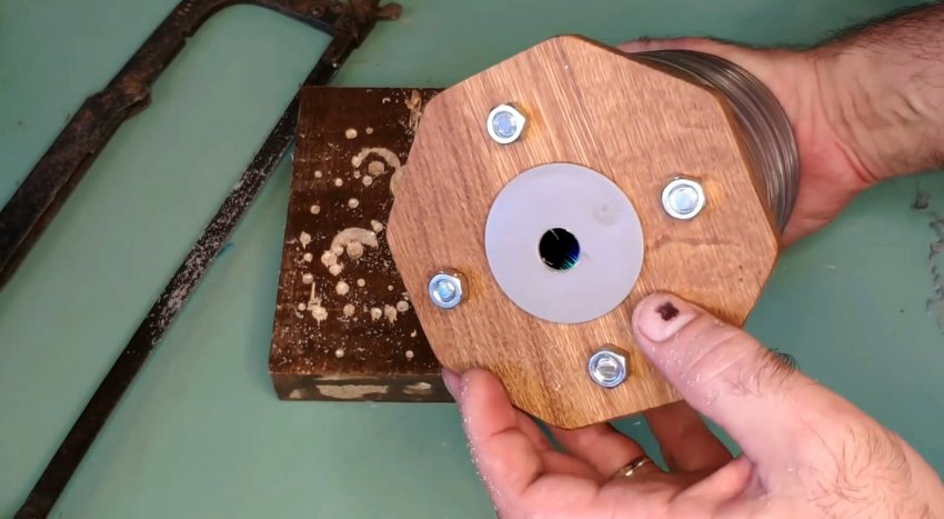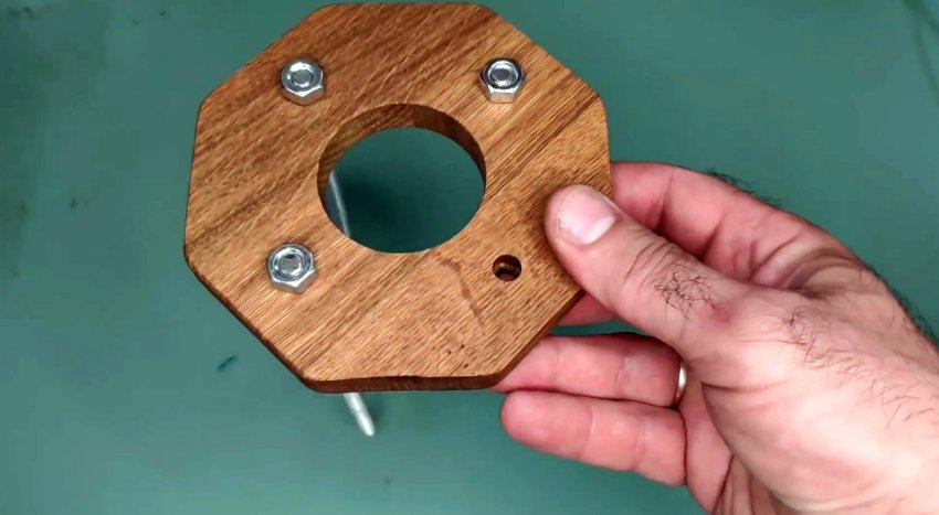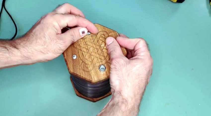 Из дерева вырезаются 2 заглушки для светильника, которые закроют дно и верхнюю лицевую часть дисков. Также нужно подготовить 4 резьбовые шпильки, чтобы соединить детали светильника.