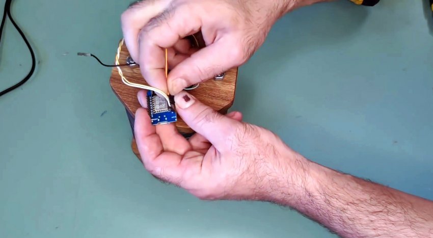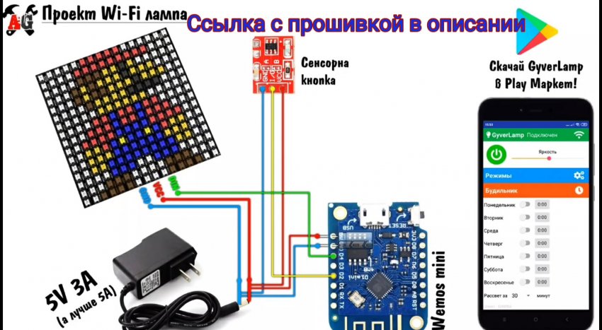 Далее можно заняться электронной начинкой. По предложенной схеме необходимо соединить гибкий световой модуль, сенсорную кнопку, микроконтроллер и блок питания. Для управления светильником, на телефон скачивается предложенное приложение.