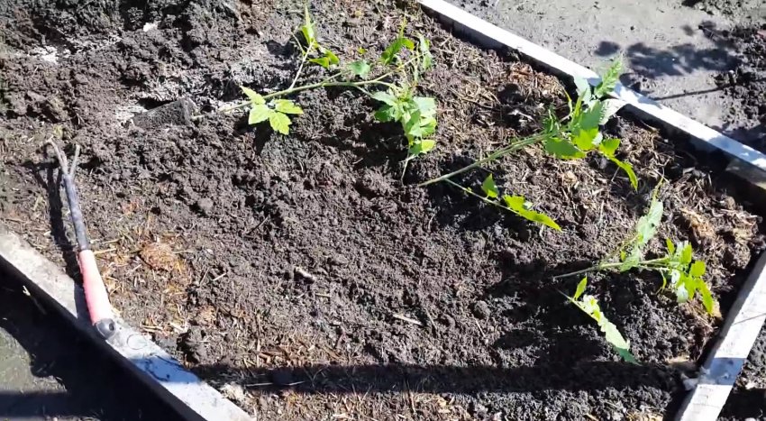 Для посадки томатов данным способом нужно под каждое растение проделать на грядке неглубокую бороздку в направлении с юга на север. Она должна полностью вмещать лежа корень с грунтом из горшочка, а также иметь запас длины еще 10 см. На ее дно насыпается вперемешку древесная зола с измельченной яичной скорлупой.