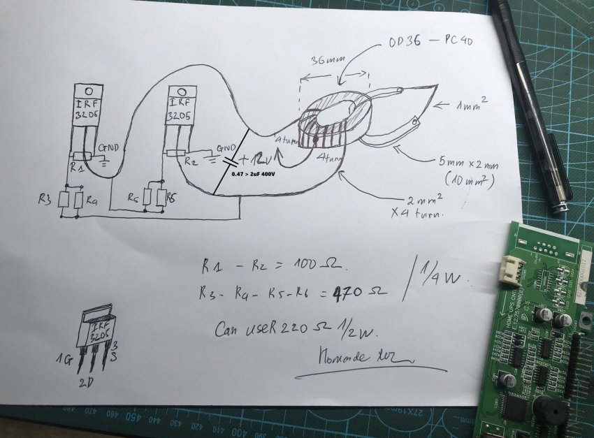 Питание катушки подводим по предложенной схеме с использованием полевых транзисторов IRF3205 и резисторов 470 Ом, 100 Ом. На рукоятку устанавливается контактная кнопка, и жало на шины. В результате получаем мощный паяльник на 12В с мгновенным разогревом.