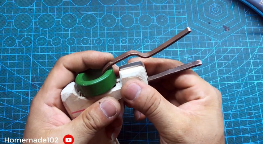 Из фанеры или доски выпиливается 2 половинки корпуса паяльника с пистолетной рукоятью. Затем из медной шины выгибается скоба. Для нее нужно прорезать в корпусе пазы.