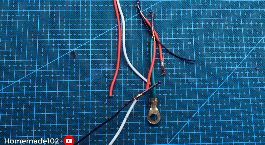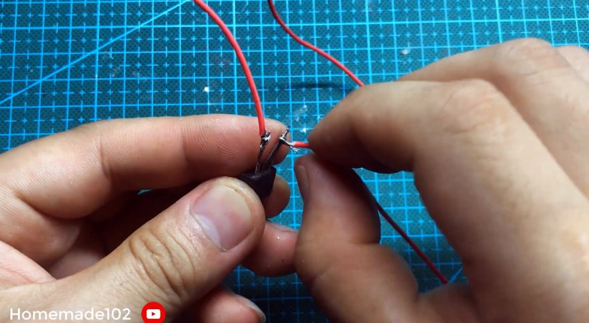 Необходимо примотать провод к третьей ножке полевого транзистора IRF3205. Ножки 1 и 2 скручиваются вторым проводком.