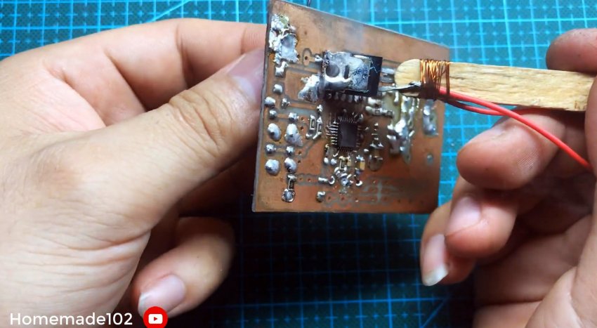 Скоба вставляется в корпус, и на нее надевается круглый ферритовый сердечник для катушки индуктивности. На последнюю наматывается 4 витка медной проволоки 2 мм.