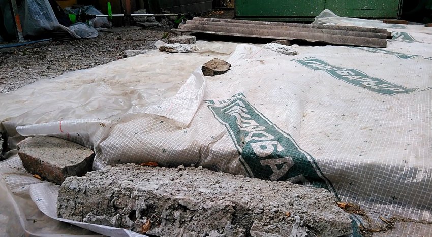 Для исключения быстрого испарения воды, что приведет к растрескиванию и потери прочности бетона, накрываем стяжку водонепроницаемой пленкой.