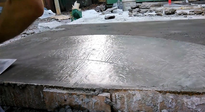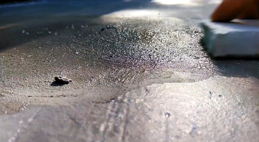 Далее, смачивая поверхность бетона водой, наводим декор-шероховатость путем круговых движений полиуретановой затиркой.