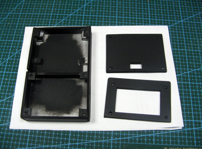 Покрасил коробочку краской из баллончика. Сразу вырезал рамку под индикатор. Изнутри приклеил оргстекло, для защиты индикатора.