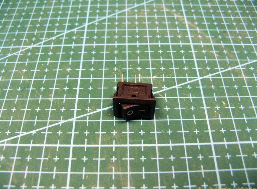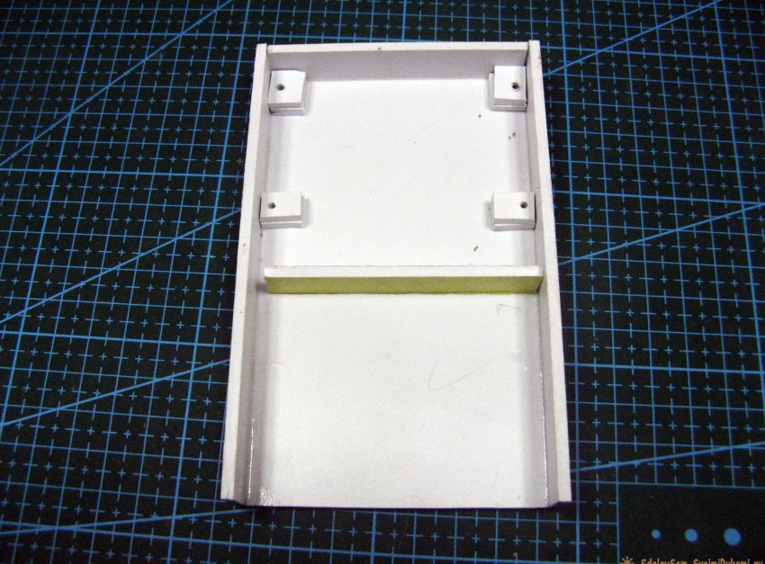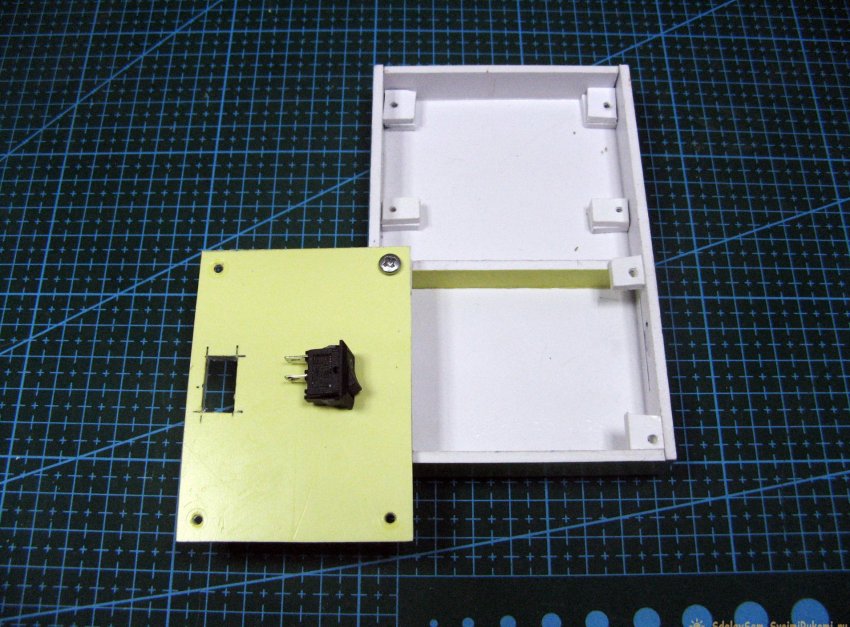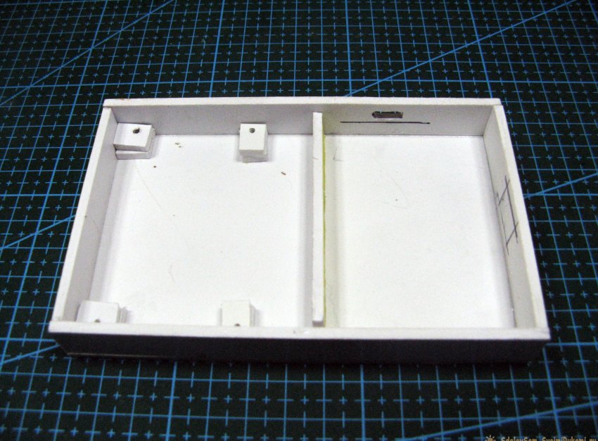 Вырезаю нижнюю крышку коробочки. Размечаю окно под выключатель. Подклеиваю крепежные подставки. Сразу размечаю отверстия под саморезы.