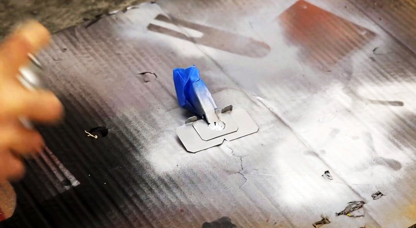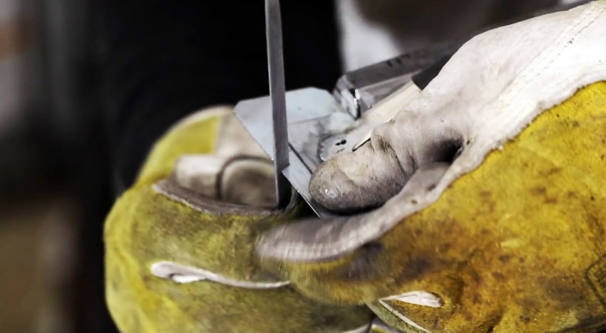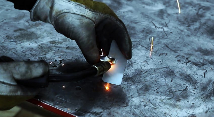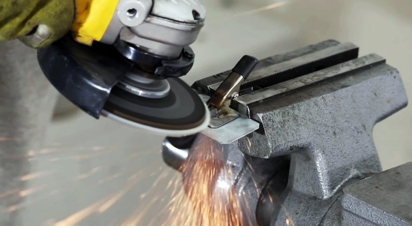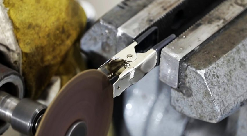 Затем в нем зажимаются пластины. Каждая из них приваривается к своей губке. Далее сварочный шов зачищается, и в центре пластин делается пропил.