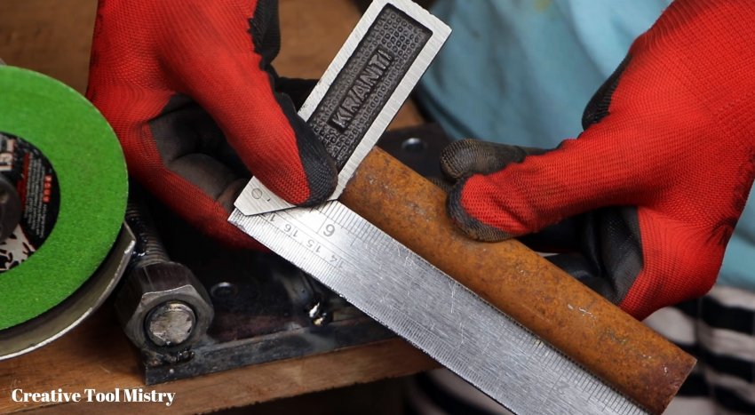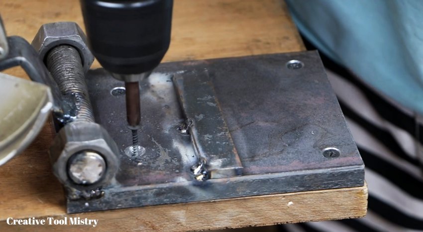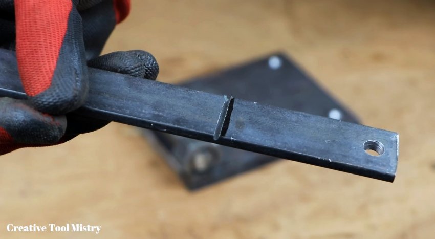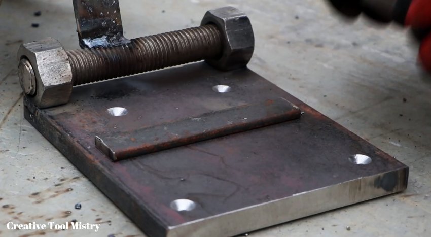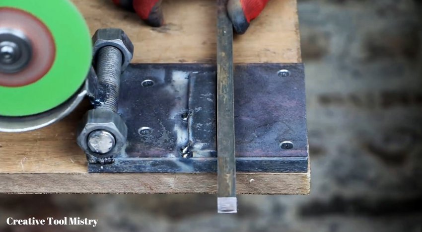 К подошве приваривается упор из полосы, по которому можно будет равнять заготовки перпендикулярно отрезному диску. Затем станок устанавливается на угол стола и прикручивается саморезами.