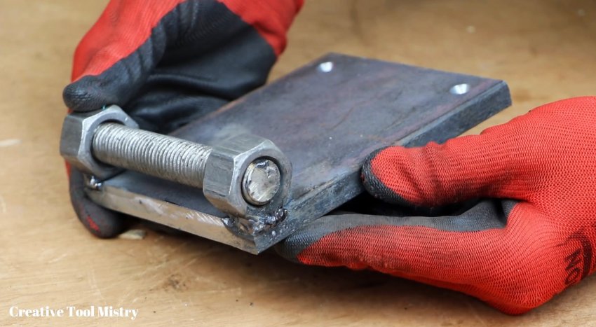 Далее потребуется приварить второй край уголка к шпильке так, чтобы диск болгарки проходил сбоку подошвы, и располагалась строго параллельно относительно нее.