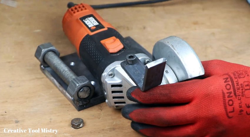 Из полосы сгибается уголок с отверстием с краю. Его нужно прикрутить к болгарке через штатное отверстие для крепления съемной ручки.