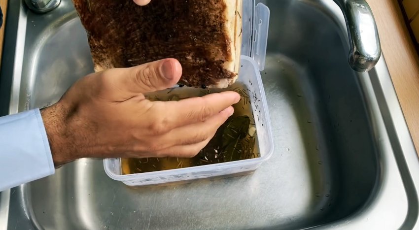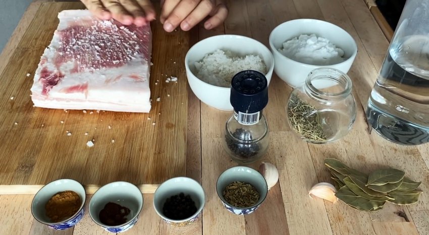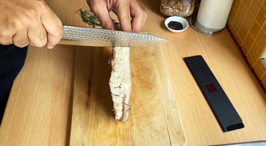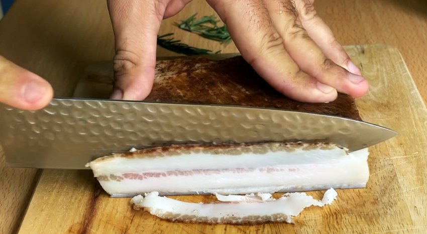 Лучше всего использовать сало без прорези. Поэтому если на нем есть мясо, то его стоит срезать для других блюд. Также удаляется кожа, так как она препятствует пропитыванию пряностями.