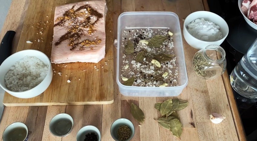На дно контейнера выкладывается половина лавровых листьев, долек чеснока и прочих немолотых специй, а также немного соли. Само сало с двух сторон обсыпается пряностями.