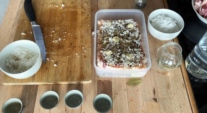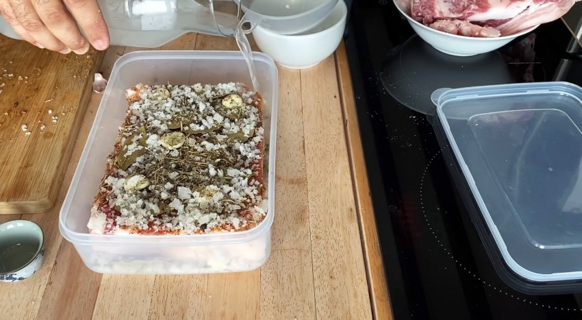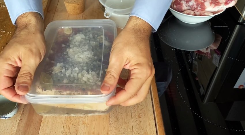 Для созревания сала нужно подобрать пластиковый контейнер. Изнутри он натирается чесноком. Конечно, это не мраморная емкость, как в оригинальном рецепте, но и в нем лардо тоже получится отличным.