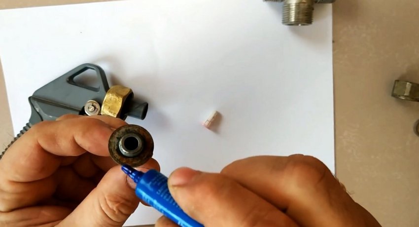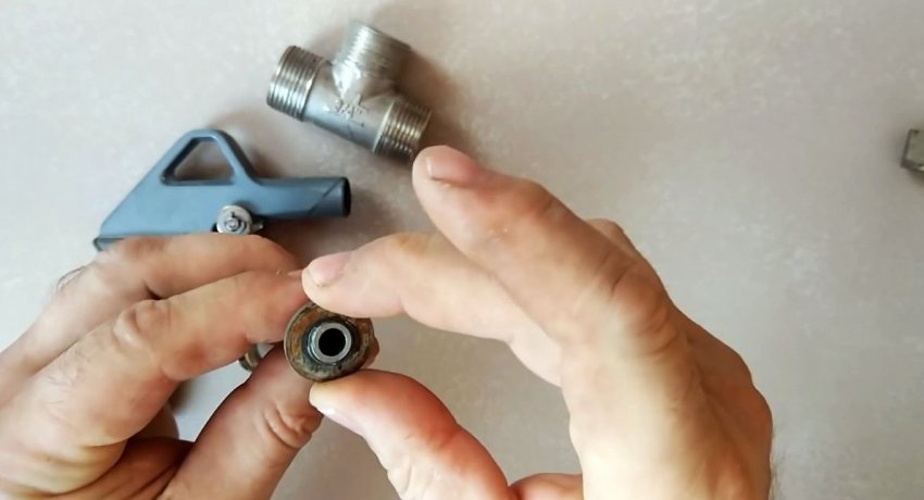 В завершение нужно сделать форсунку. Можно использовать трубку на 6 мм или толще. Она впаивается в штуцер с гайкой и наворачивается на сгон для счетчика.