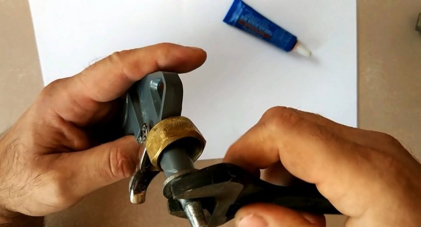 Затем нужно поставить на пистолет гайку, и накрутить носик с шайбой, промазав все фиксатором резьбы.