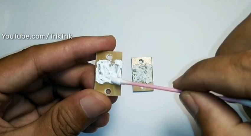 Для пайки плата укладывается на подошву утюга и разогревается. Аналогичным образом подготавливается вторая плата.