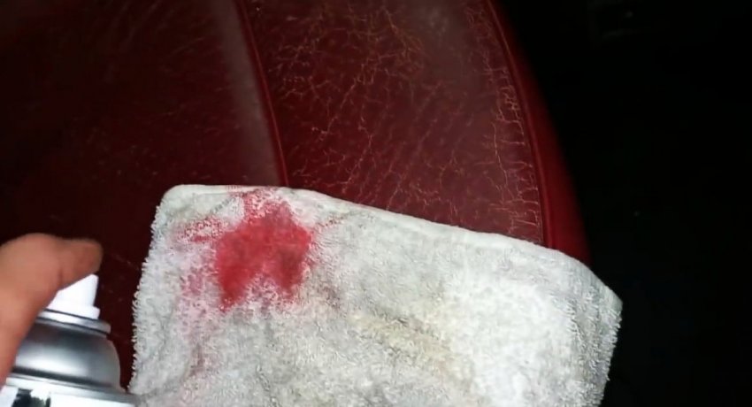 Чтобы скрыть белые трещинки на коже, их нужно закрасить. Для этого используется обычная аэрозольная краска. Можно срезать для образца небольшой лоскут кожи на обратной стороне сидения, и в магазине подобрать краску в этот тон.