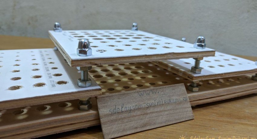 Сверху устанавливается вторая большая деталь с перфорацией под сверла, и поджимается гайками. Далее накручивается еще по гайке, и на них размещаются одинаковые перфорированные детали. На коротких шпильках их нужно поджать колпачковыми гайками.