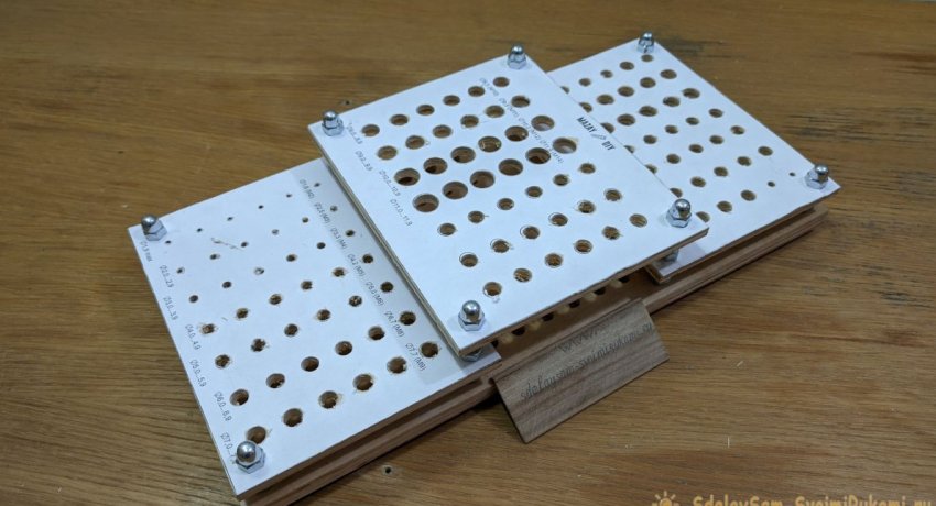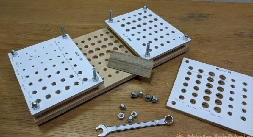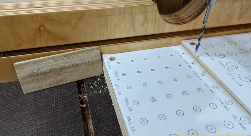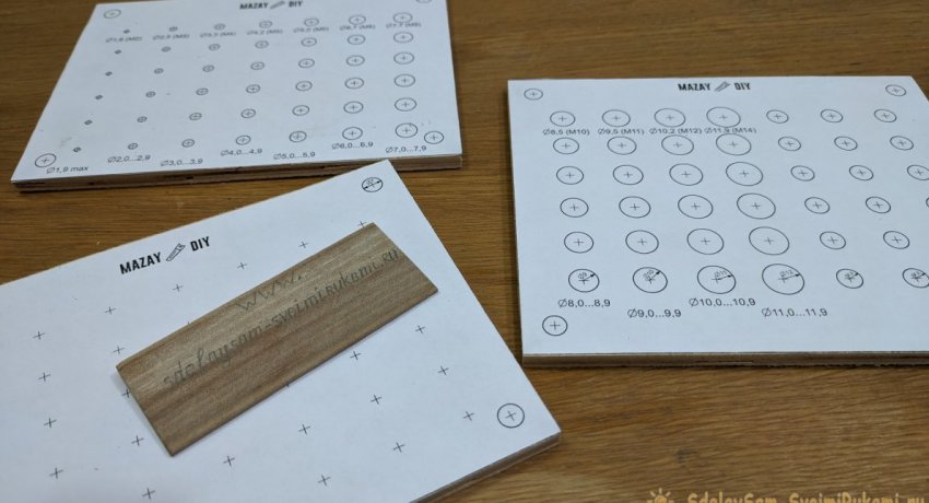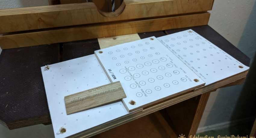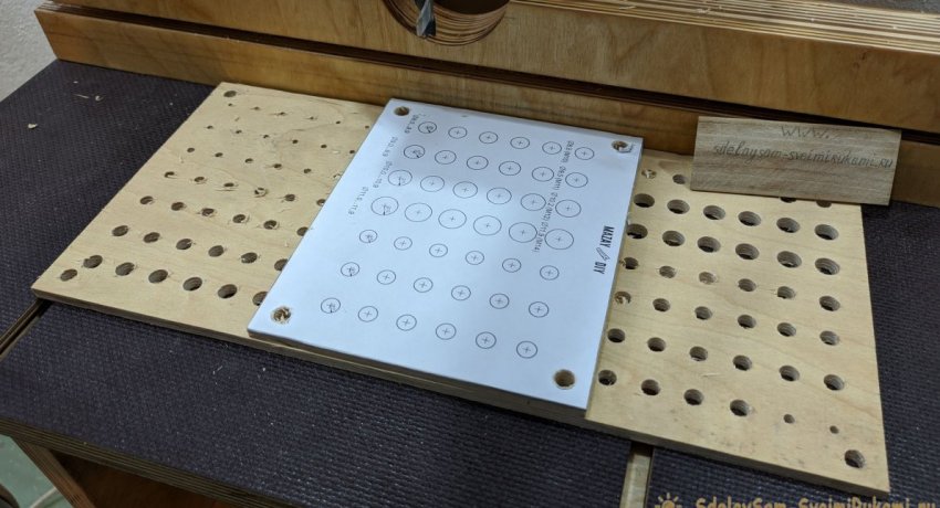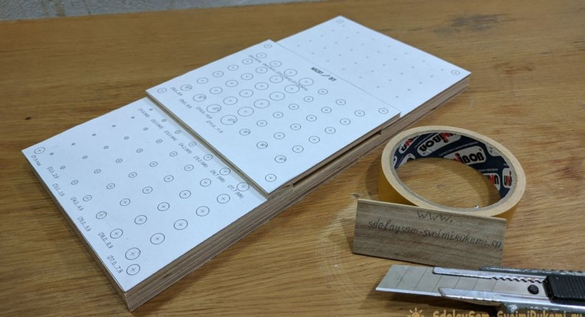 По размеру трех меньших заготовок необходимо распечатать бумажный шаблон с метками для сверления посадочных отверстий под сверла разных диаметров. Их размеры необходимо подписать. После этого шаблоны приклеиваются на фанеру.