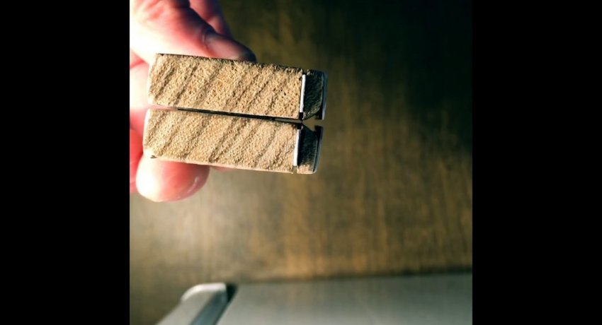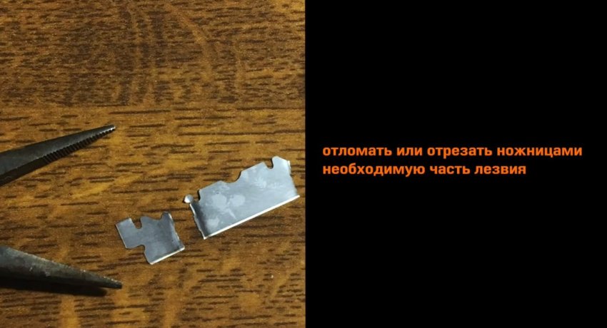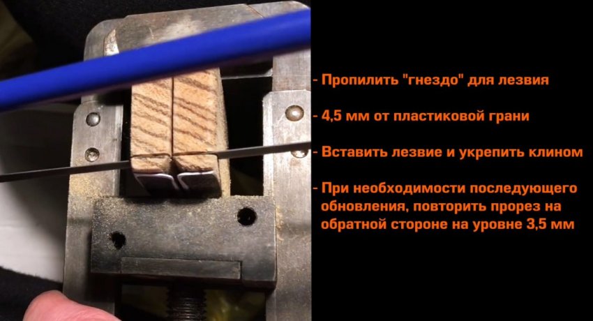 В заготовке делается пропил на 4,5 мм ниже пластиковых накладок. В него вставляется обломок лезвия острием вперед, и фиксируется клином.