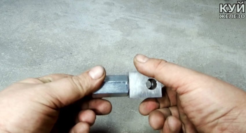 Далее нужно будет примерить редуктор болгарки и домкрат. Для их соединения делается переходник. Берется удлиненная гайка М14, и к ней привариваются проушины. Она будет наворачиваться на шпиндель болгарки, а ее проушины соединятся с винтом домкрата.