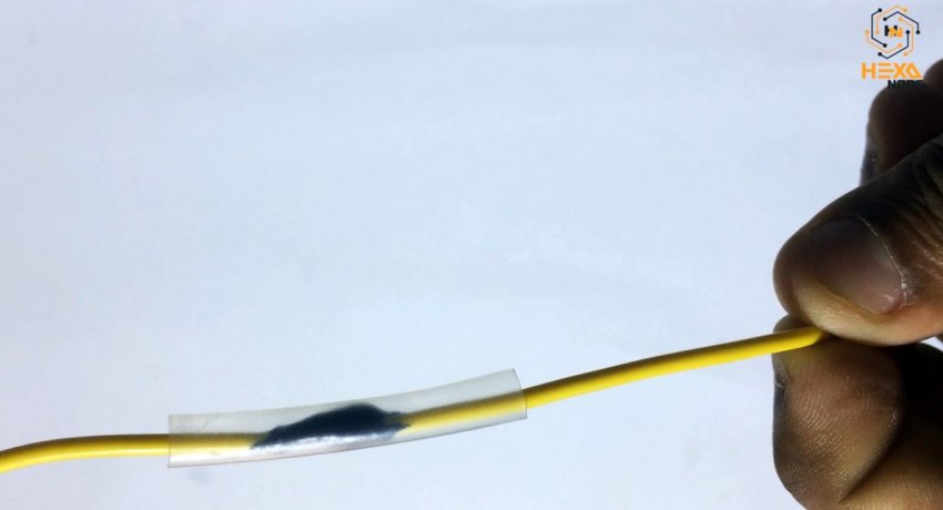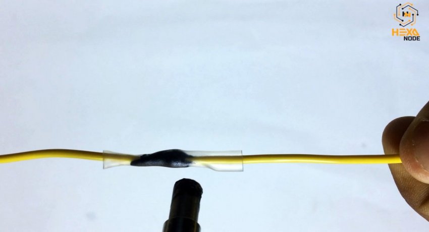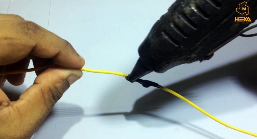 На скрутку наносится термоклей. Нужно его равномерно распределить, полностью закрыв оголенные жилы.