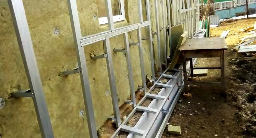 Подвес прикручивается к срубу. Между его боковин вставляется вертикальная стойка из CD профиля и прикрепляется саморезами. Выступающая часть проушин подгибается в сторону, чтобы не мешать сайдингу.