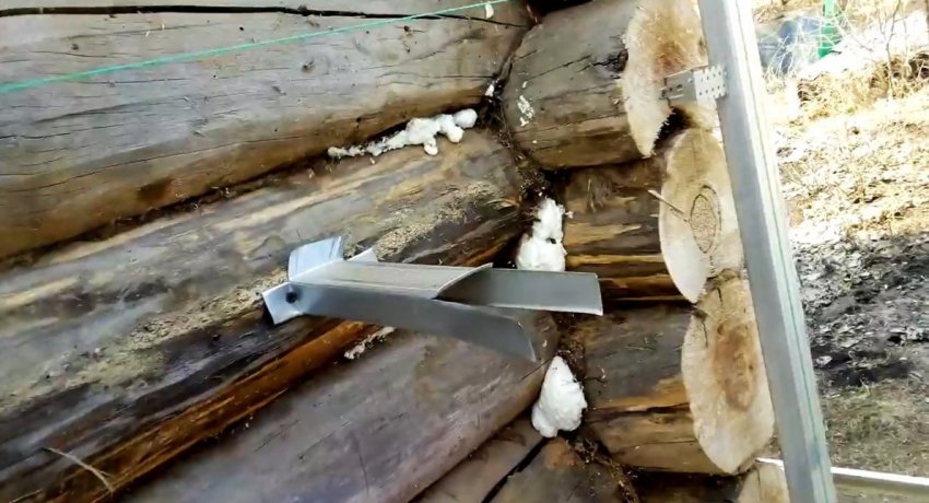 Заготовка прислоняется проушинами к срубу. Затем ее нужно обрезать с запасом, чтобы она выходила за шнур на 2-3 см.