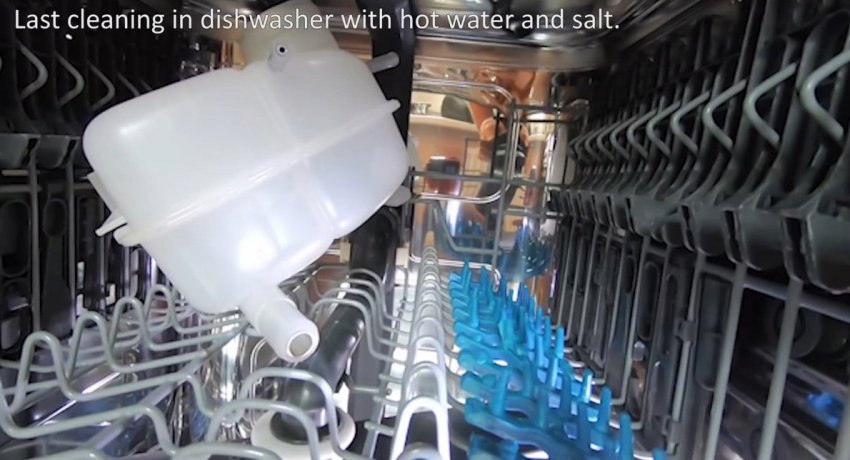 В завершение бачок можно поставить ополоснуться в посудомоечную машину без использования порошка, достаточно просто соли.