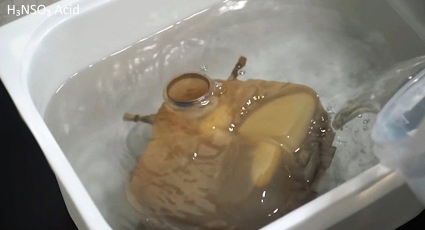 Изолента и крышка бачка снимаются, и он погружается в раствор сульфаминовой кислоты.