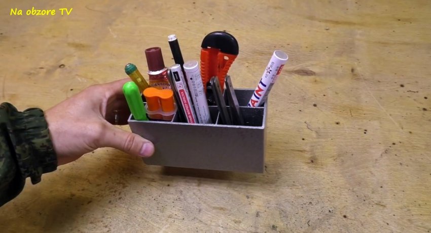 После ее высыхания органайзер готов. В нем можно хранить карандаши, чертилки, керны, сверла, монтажные ножи с лезвиями и т.д.