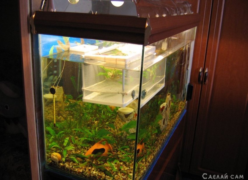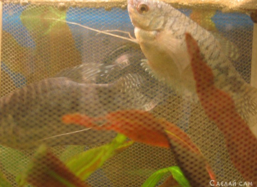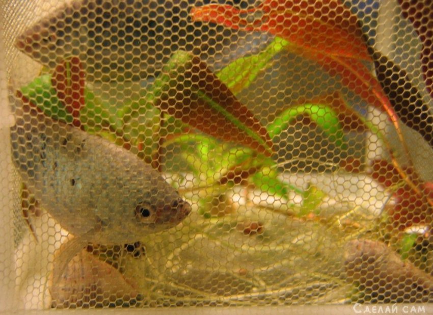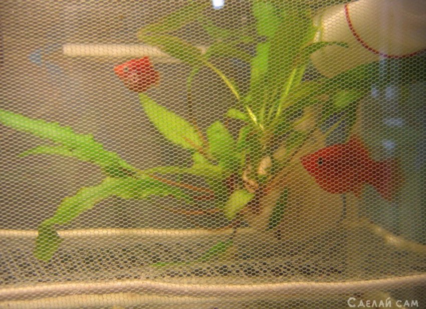 Отсадник разделен на две части. Нижняя часть нужна, чтобы рыбка не смогла поесть свою же икру. Так спасаем потомство.