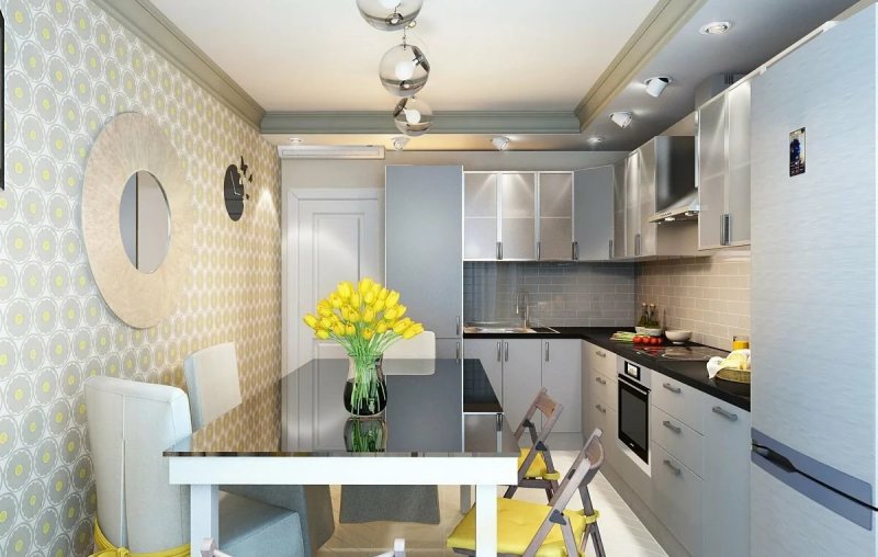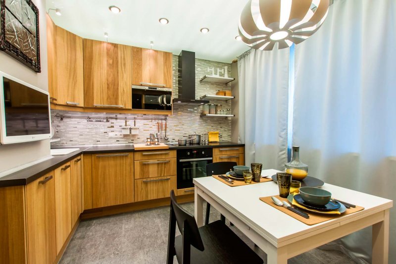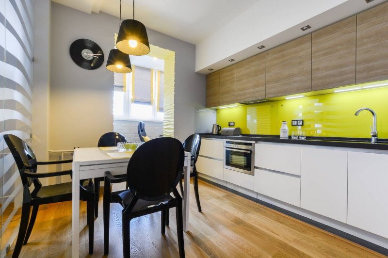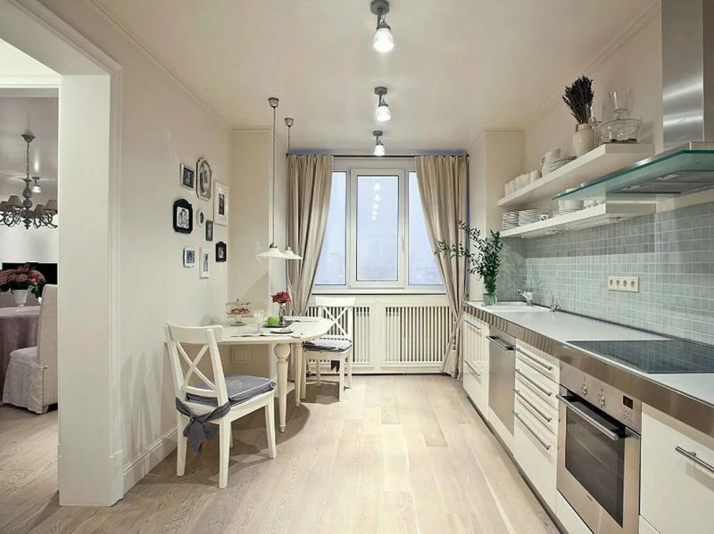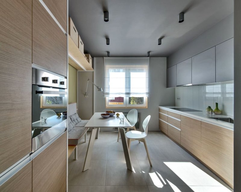 Современная кухня может иметь любую планировку. Если из комнаты есть выход на закрытую лоджию или балкон, там можно оборудовать обеденную зону. Дверь убирают вовсе или завешивают проем незаметными однотонными шторами, легким тюлем, подходящим под интерьер.