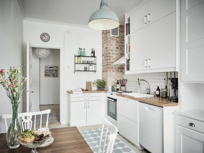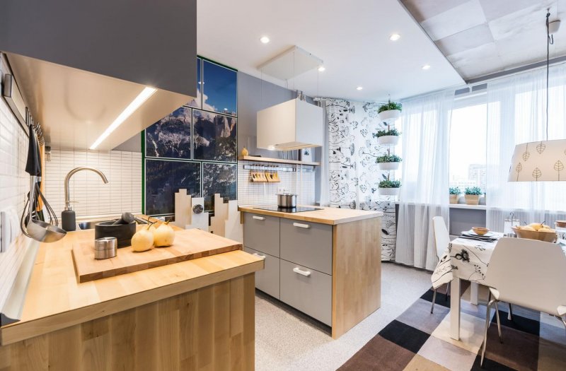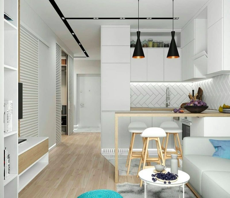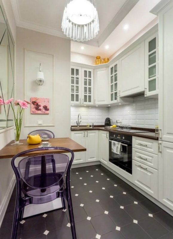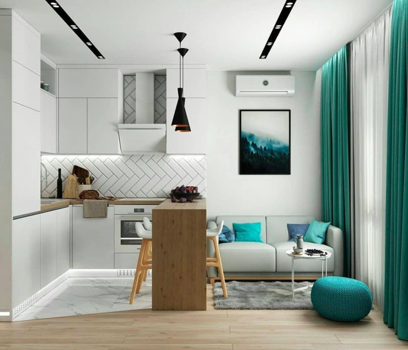 В этом случае рекомендуется максимально использовать потенциал стен. Вешать на них полки, навесные шкафы, достигающие потолка. Для разделения функциональных зон используется обеденный стол, под которым дополнительно можно организовать подиум. Также в качестве зонирования можно применять осветительные приборы, выбрать разные по цвету или составу отделочные материалы.