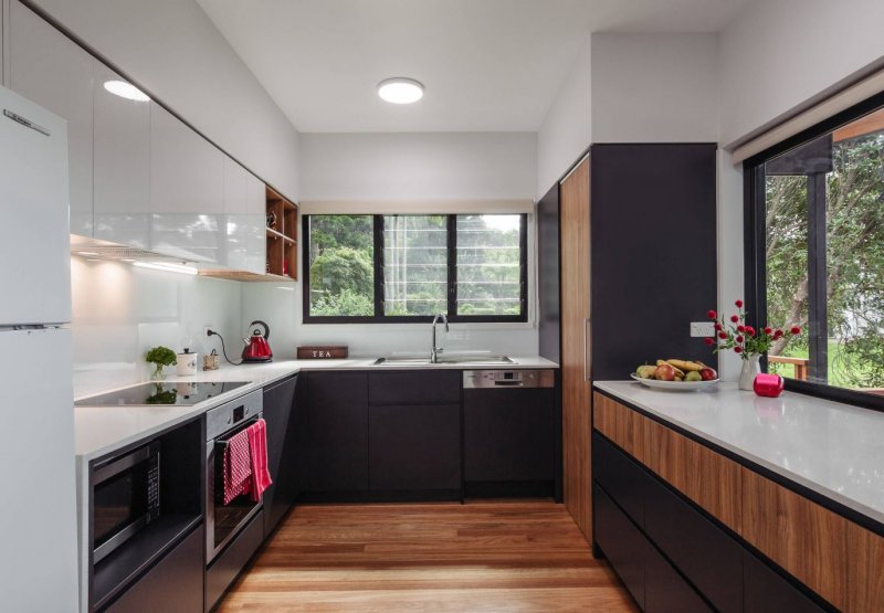 Не всегда вдоль одной стены можно полностью разместить все необходимое. В этом случае можно установить мебель в две линии. Расположение мебельных модулей в два ряда еще называют параллельной планировкой. Она уступает в популярности Г- и П-образным способам организации пространства, но стоимость гарнитура будет на порядок дешевле, из-за отсутствия торцевых элементов и угловых шкафов.