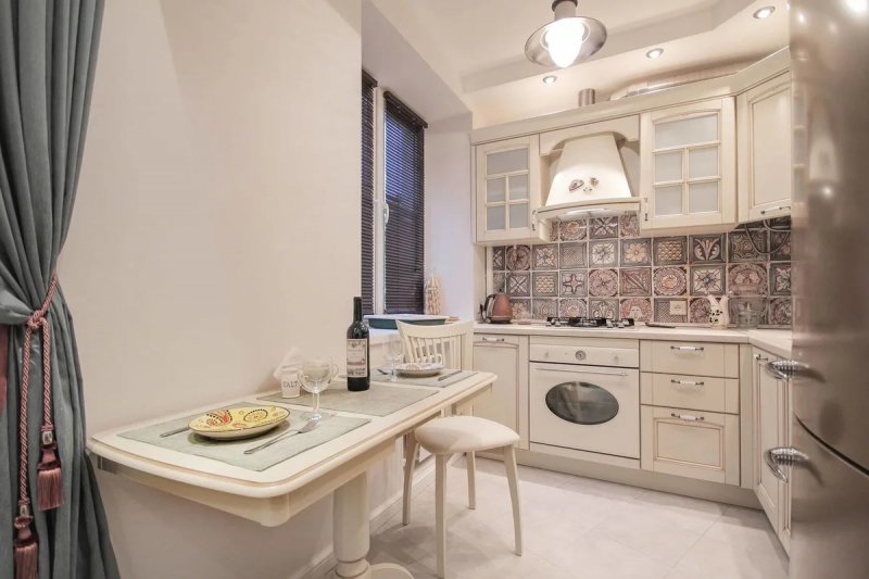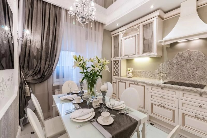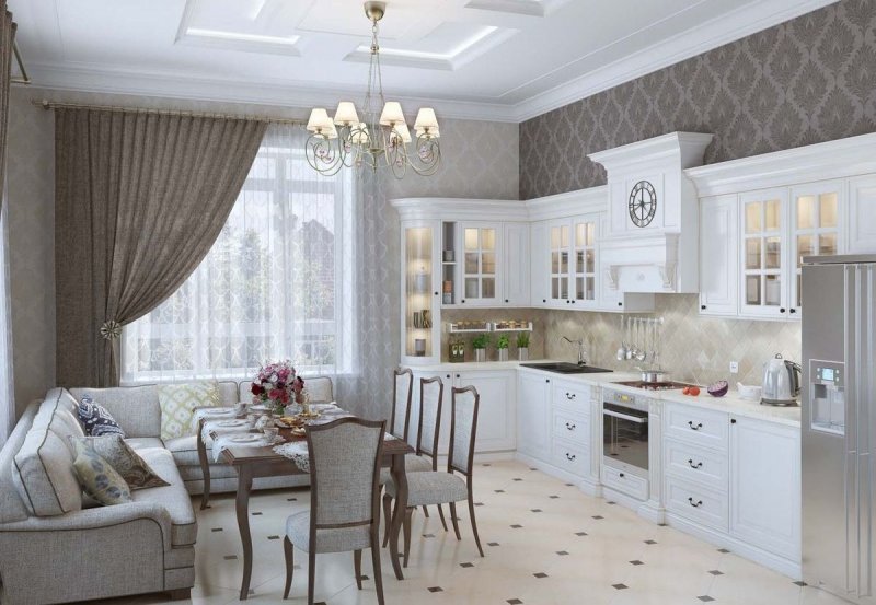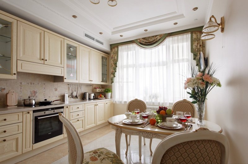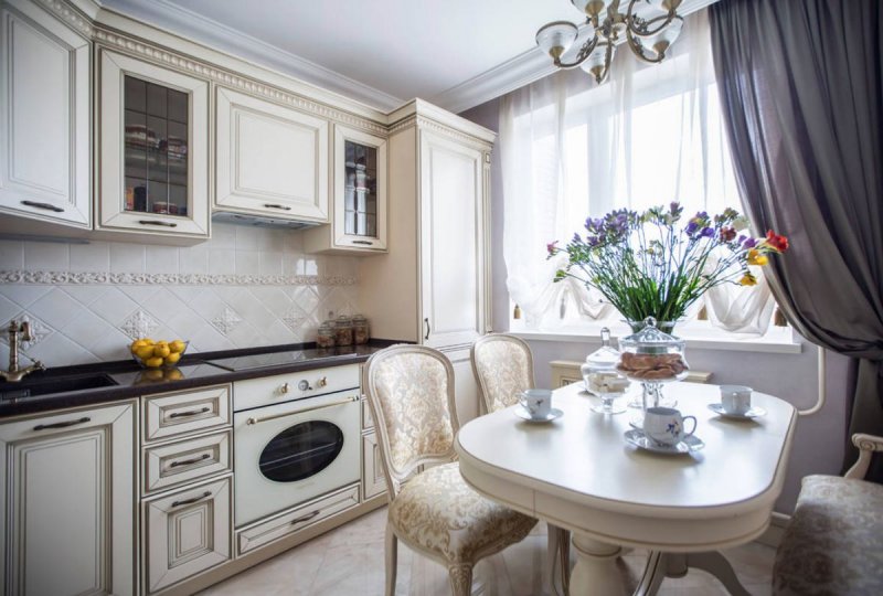 Устоявшийся дизайн, используемый несколькими столетиями, по нраву любителям постоянства и роскоши. Законченный образ будет выглядеть солидно и элегантно. Обстановку часто украшает дорогая лакированная мебель, гарнитур с резными узорами и золотистой фурнитурой. Молочно-белый, коричневый, песочный цвет являются часто преобладающими на такой кухне. В тон к ним подбирают бытовую технику (холодильник, микроволновку, духовой шкаф, варочную поверхность). Столешницы делают из натурального камня.