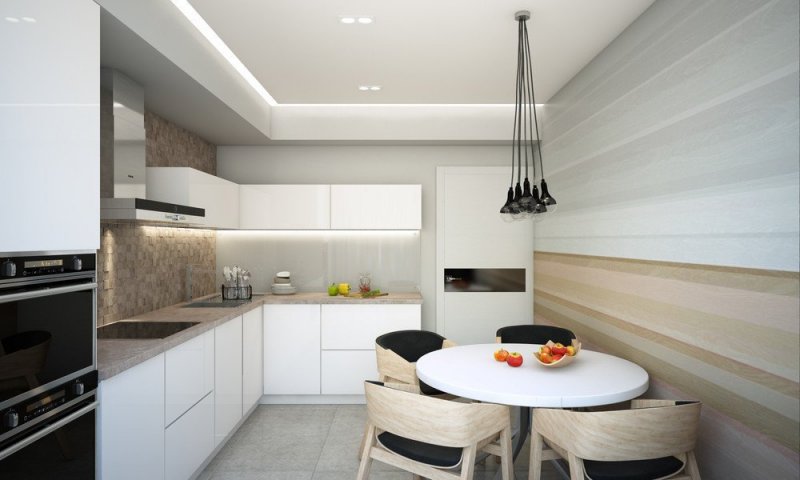 Интерьер такой кухни делают однотонным. Яркие цвета выступают в качестве акцентов и очень дозировано. Чтобы разнообразить скучный дизайн, используют сочетание фактур. Хорошо смотрятся в одной композиции глянцевые и матовые поверхности, камень и дерево, различные панели с 3D эффектом.