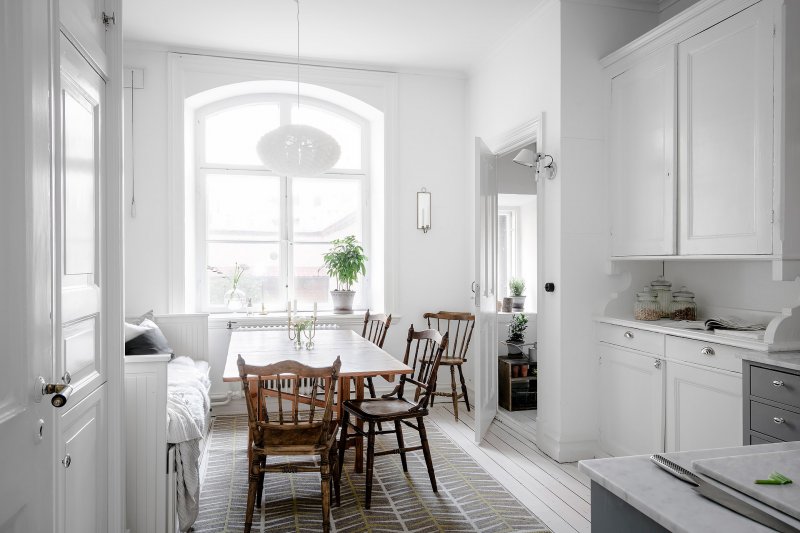 Зона отдыха и обеденная группа должны располагаться по соседству. Мягкий диван можно придвинуть в угол или поставить у стены напротив кухонного гарнитура. Место в центре в этом случае будет занимать большой стол. Если кухня имеет выход на балкон, диван устанавливают вдоль одной стены с гарнитуром. Одна боковая его часть будет касаться стены с окном, другая боковой стенки кухонного стола.