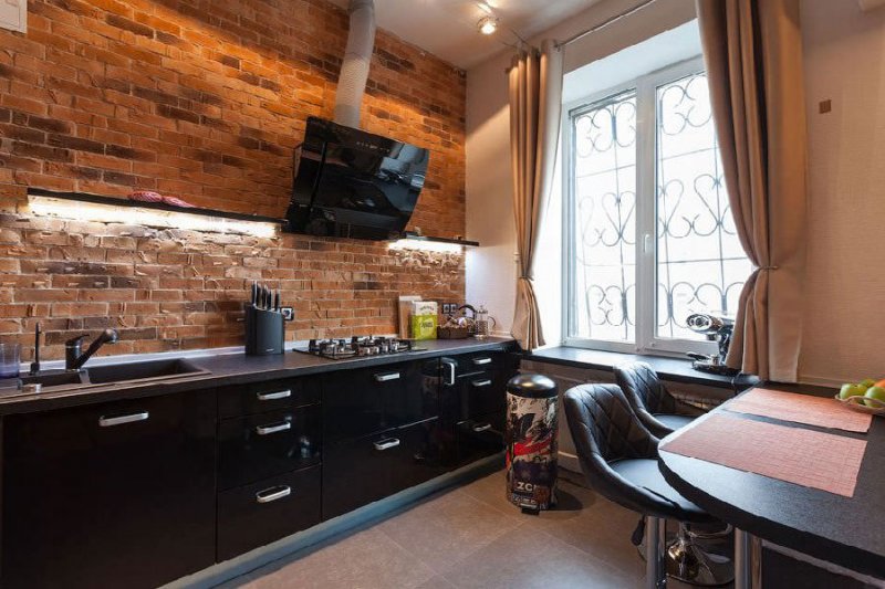Кухонный гарнитур и бытовую технику можно расположить как у глухой перегородки, так и у стены с оконным проемом. Во втором случае необходимо соблюдать технику безопасности. Окно нельзя закрывать занавесками, которые ветром может задуть на огонь и произойдет возгорание. Вдоль проема лучше установить рабочую поверхность, а раковину и плиту разнести в разные стороны.