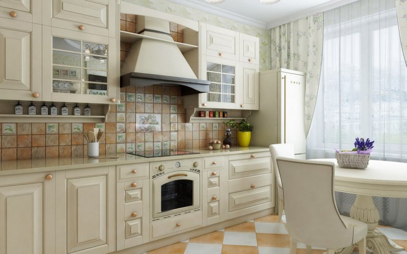 Стильным акцентом в провансе будет оригинальная вытяжка, замаскированная под выход печной трубы. Для отделки поверхностей используют натуральное дерево, глину, мел, штукатурку. Скатерти и обои однотонные или в мелкий цветочный рисунок.