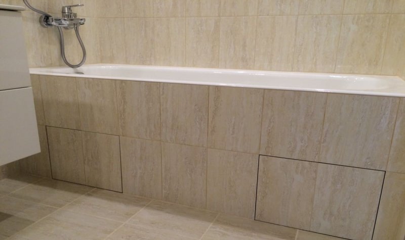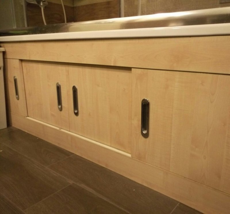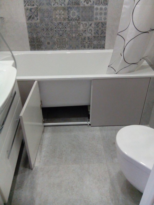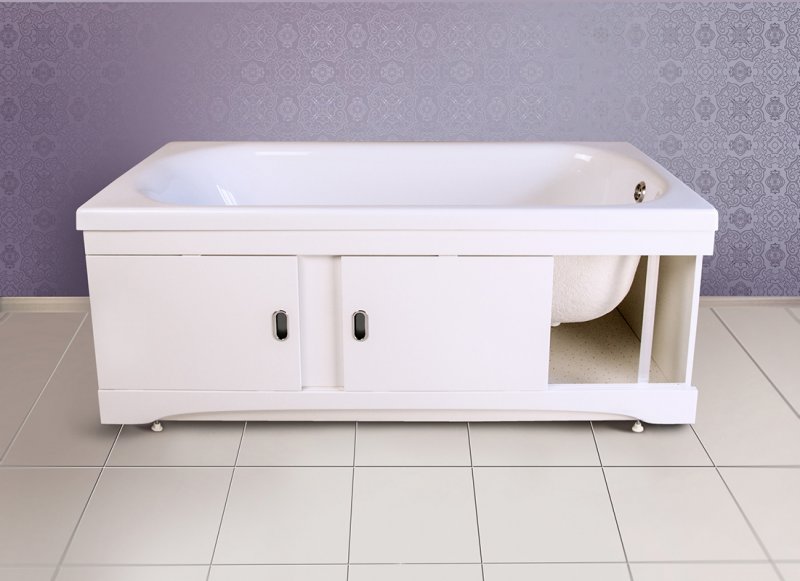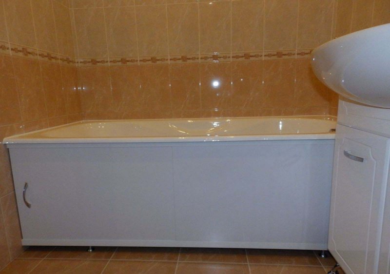 Это улучшенная версия сплошного экрана. В панели могут быть 1-2 дверцы, которые обеспечивают легкий доступ к трубам и хранящейся под ванной бытовой химии. Используются как съемные дверцы, так и оснащенные петлями – вторые гораздо удобнее. За дверцами можно оборудовать стойки с полочками, к панелям можно прикрепить пластиковые органайзеры для хранения мелочей.