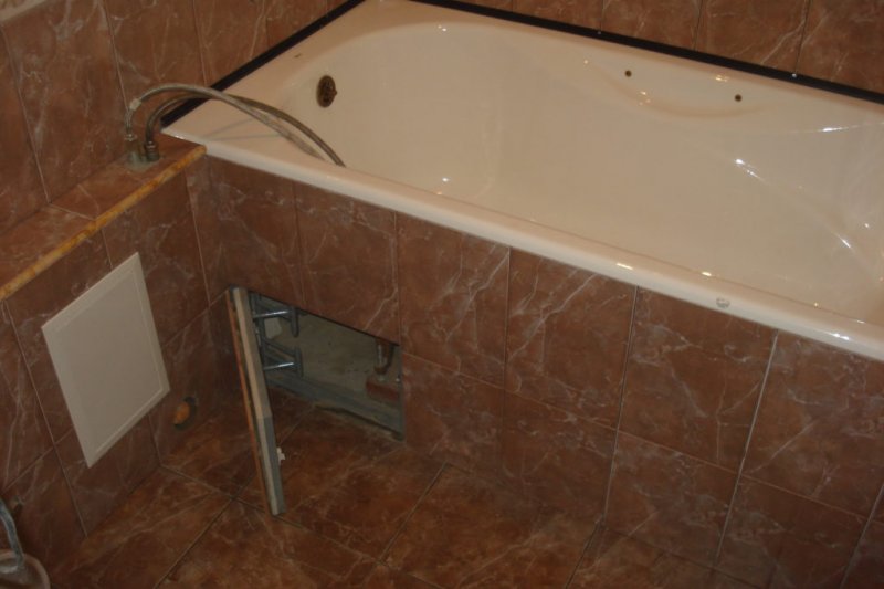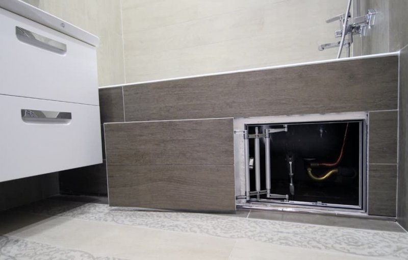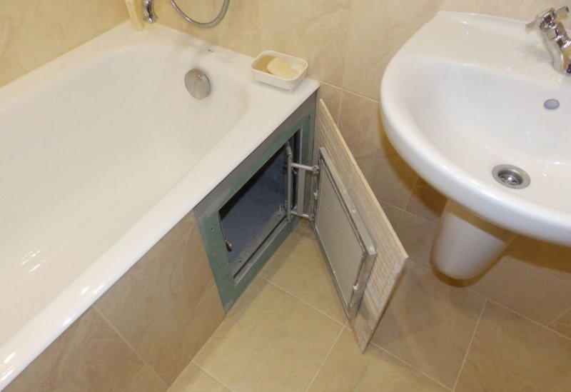В конструкции экрана для ванны непременно должен присутствовать открывающийся или съемный люк, который обеспечивает доступ к коммуникациям.
