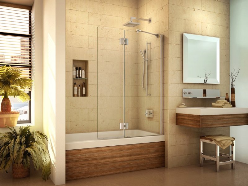 Учитывайте оформление санузла. Экран должен сочетаться с отделкой по стилю, цветовой гамме и фактуре. Отличным выбором для небольших помещений может стать перегородка с зеркальной поверхностью. Ее способность к отражению способствует визуальному расширению пространства. Изделия с фотопринтом следует подбирать с особой тщательностью. Согласитесь, в морской стилистике экран с цветочками или животным принтом будет неуместен. Если в отделке использовались контрастные элементы, экран лучше сделать однотонным. Красочные рисунки будут уместны в спокойных интерьерах, оформленных в едином цвете.