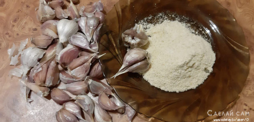 Мука будет впитывать в себя лишнюю влагу. Для этого нужно взять отдельную емкость и насыпать слой пшеничной муки. Затем каждую головку чеснока следует также обкатать в муке и положить в эту емкость. Сверху также насыпается еще один слой муки, после чего емкость закрывается крышкой.