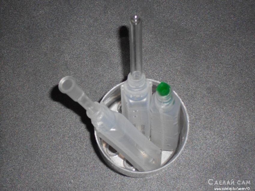 Если срезать дно помпы, а внутрь вставить колпачок шприца с отверствием, то ампула становится небольшой воронкой.
