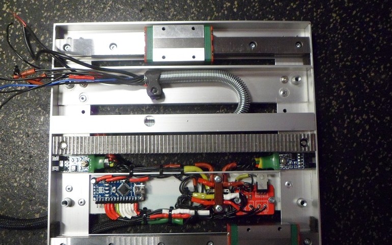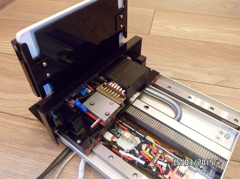 Хочу поделиться одним из вариантов изготовления СИСТЕМЫ ПЕРЕМЕЩЕНИЯ монитора в машине. Цель - попытаться сделать достаточно надежную и качественную систему. В варианте, который буду описывать, использована реечная передача для перемещения каретки и коническая передача для подъема монитора в вертикальное положение. Компоненты системы: рейка модуль 1. Шестерня прямозубая. Конические шестерни . Сервомашинка SM-S4315R непрерывного вращения для перемещения каретки по горизонтали. Сервомашинка SM-S8166M для подъема монитора. Линейные подшипники серии MGN 15. Контроллер Arduino Nano. DC_DC преобразователи для питания сервомашинок. Оптические прерыватели (концевики). Вся конструкция выполнена из алюминиевого профиля. Для начала сделаем основу-раму. Размеры всех заготовок и деталей должны быть максимально точны. Сотки миллиметров можно игнорировать, даже десятки можно не брать в расчет, но в миллиметрах все должно быть точно. Итак делаем раму. Используем тяговые заклепки. Углы проверяем- 90° обязательное условие. Крепим линейные подшипники. Я использовал заклепки - гайки. Все резьбовые соединения ставлю на вот такой фиксатор - защита от вибрации и все такое. Ставим одну коническую шестерню на большую серву. Использую все тот же фиксатор для резьбы. Делаем каретку. Уголок из алюминия использовал толщиной 3 мм. Он должен нести основную нагрузку. Делаем разметку под большую серву и боковые кронштейны. Боковые кронштейны сделал по такому принципу: в прямоугольную трубу 30х15х1.5 мм вставил квадрат 12х12 мм и все обжал винтами. Весь алюминий, который использую в работе конструкционный и размеры ГОСТ-овские, поэтому можно подобрать все по размеру. Итак внутренний размер прямоугольной трубы идеально совпал с наружным размером квадрата. Высверливаем отверстия под радиальные миниатюрные подшипники. Здесь я использую такие размером 6 x 10 x 3 мм. Хочу обратить внимание на такой момент-сначала сверлим глухое отверстие ?6 и глубиной не более 10 мм. Затем расширяем отверстие до ?10 и глубиной max 5 мм. Объясню для чего это нужно. У подшипника, который я использую есть реборда-она не даст ему провалиться в отверстие и в дальнейшем позволит удобно зафиксировать. А в углубление ?6 кладем шарик от подшипника ? 5-5,5 мм для того, чтобы в дальнейшем наша ось не «клинила», упираясь торцом. Теперь изготовим саму площадку для монитора. Хочу добавить, что описанный вариант делается под планшет размером 190х112х10. Прикинув размеры вырезал такой «подиум». «Ноги» сделаны по принципу вышеописанных кронштейнов. Ось из латунного прутка ?6 мм. «Ноги» прикручены и приклеены намертво вот таким клеем. Оказался очень достойный клей . Удобно работать. Сразу не «встает». После отверждения становиться очень прочным. Получился такой узел. Так выглядит каретка с
