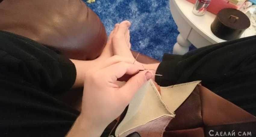 Я прошиваю вручную. Можно конечно же использовать более простой вариант - швейную машинку. Но увы, моя машинка не позволяет работать с кожей.